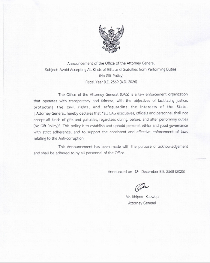 วันพฤหัสบดีที่ 1 มกราคม 2569 เวลา 07.00 น. นายฅนไท ก้วนหิ้น อัยการจังหวัดประจำสำนักงานอัยการสูงสุด และบุคลากร