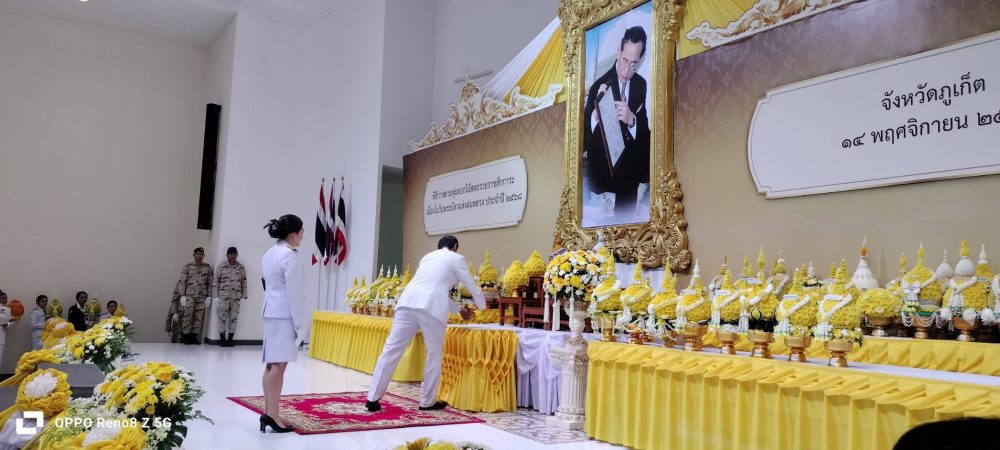 พร้อมด้วยข้าราชการธุรการ ร่วมพิธีถวายพานพุ่มดอกไม้เบื้องหน้าพระบรมสาทิสลักษณ์ พระบาทสมเด็จพระนั่งเกล้าเจ้าอยู่หัว พระมหาเจษฎาราชเจ้า ณ หอประชุมมหิศรภักดี ศาลากลางจังหวัดภูเก็ต