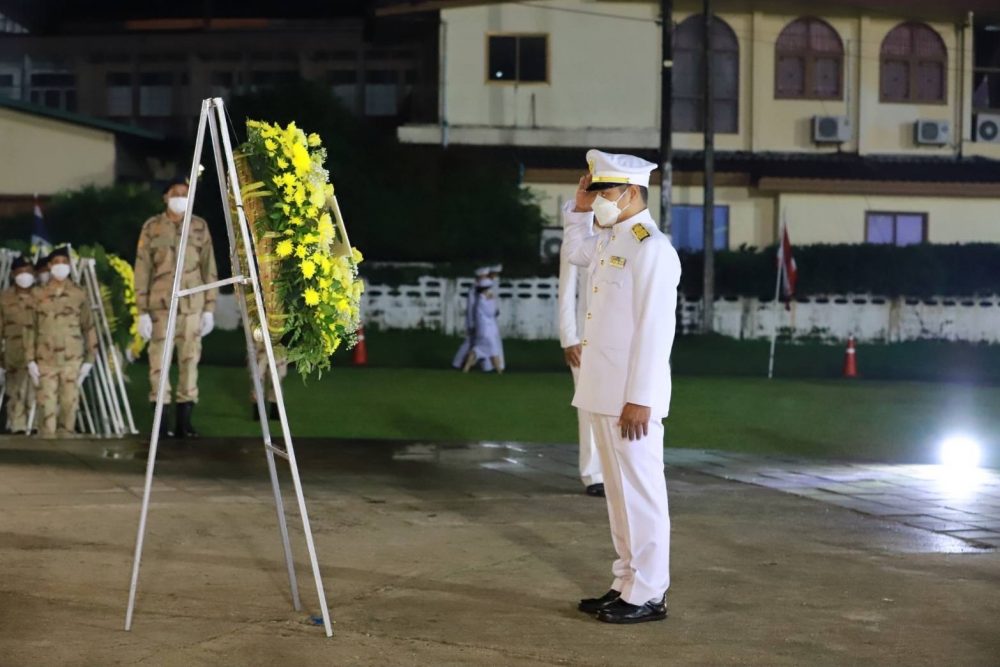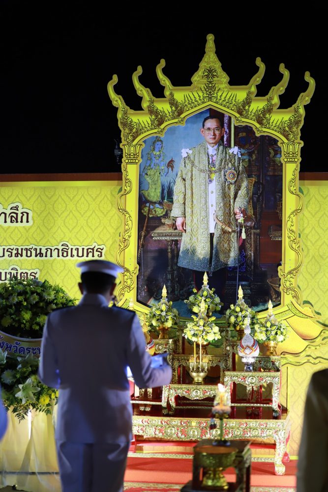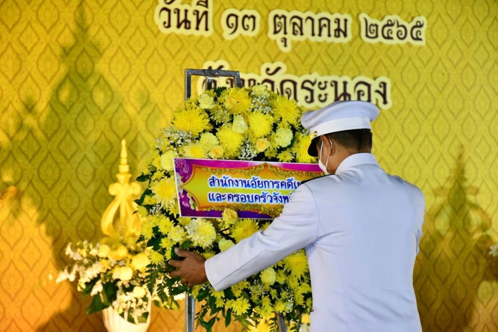 นายธรรมรักษ์ ส่องเจริญ นิติกรชำนาญการ สำนักงานอัยการคดีเยาวชนและครอบครัวจังหวัดระนองร่วมพิธีวางพวงมาลาถวายราชสักการะ และจุดเทียนน้อมรำลึกในพระมหากรุณาธิคุณ เนื่องในวันคล้ายวันสวรรคตพระบาทสมเด็จพระบรมชนกาธิเบศร มหาภูมิพลอดุลยเดชมหาราช บรมนาถบพิตร ๑๓ ตุลาคม ๒๕๖๕ ในวันพฤหัสบดีที่ 13 ตุลาคม ๒๕๖๕ เวลา ๑๗.๓๐ น. ณ บริเวณพระเมรุมาศจำลอง(เดิม) สนามกีฬาองค์การบริหารส่วนจังหวัดระนอง อำเภอเมือง จังหวัดระนอง