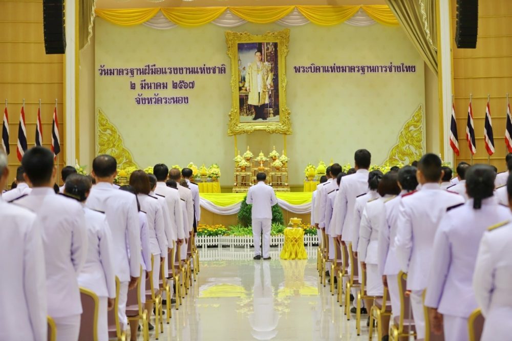 นายนิติศาสตร์ ทองจูด อัยการจังหวัดประจำสำนักงานอัยการสูงสุด สำนักงานอัยการคดีเยาวชนและครอบครัวจังหวัดระนอง ร่วมพิธีถวายเครื่องราชสักการะแด่ พระบาทสมเด็จพระบรมชนกาธิเบศร มหาภูมิพลอดุลยเดชมหาราช บรมนาถบพิตร พระบิดาแห่งมาตรฐานการช่างไทย เนื่องในวันมาตรฐานฝีมือแรงงานแห่งชาติ ประจำปี ๒๕๖๗ ในวันเสาร์ที่ ๒ มีนาคม ๒๕๖๗ เวลา ๐๘.๓๐ น. ณ หอประชุมศูนย์ราชการจังหวัดระนอง