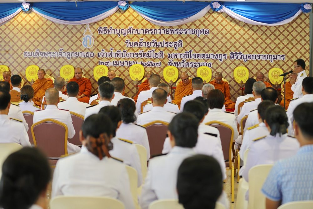 นางสาวณัฐวรินธร จิรโชติมุขสิริ อัยการจังหวัดผู้ช่วย พร้อมด้วยข้าราชการสำนักงานอัยการคดีเยาวชนและครอบครัวจังหวัดระนอง ร่วมพิธีทำบุญตักบาตร และลงนามถวาย สมเด็จพระเจ้าลูกยาเธอ เจ้าฟ้าทีปังกรรัศมีโชติ มหาวชิโรตตมางกูร สิริวิบูลยราชกุมาร เนื่องในโอกาสวันคล้ายวันประสูติ ในวันจันทร์ที่ ๒๙ เมษายน ๒๕๖๗ เวลา ๐๗.๐๐ น. ณ หอประชุมจังหวัดระนอง ศูนย์ราชการจังหวัดระนอง