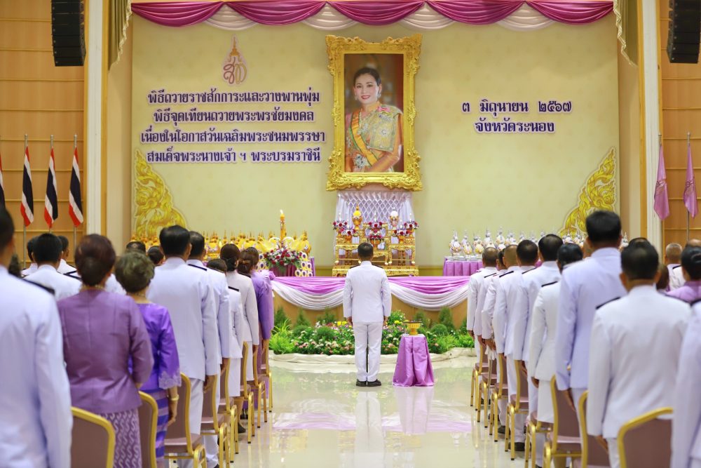 นายธนิต จตุรทิพประดับ อัยการจังหวัดประจำสำนักงานอัยการสูงสุด สำนักงานอัยการคดีเยาวชนและครอบครัวจังหวัดระนอง ร่วมพิธีถวายเครื่องราชสักการะและวางพานพุ่มและพิธีจุดเทียนถวายพระพรชัยมงคล เนื่องในโอกาสมหามงคลวันเฉลิมพระชนมพรรษา สมเด็จพระนางเจ้าสุทิดา พัชรสุธาพิมลลักษณ พระบรมราชินี ๔๖ พรรษา ๓ มิถุนายน ๒๕๖๗ ในวันจันทร์ที่ ๓ มิถุนายน ๒๕๖๗ เวลา ๑๘.๐๐ น. ณ หอประชุมคอซู้เจียง ศาลากลางจังหวัดระนอง