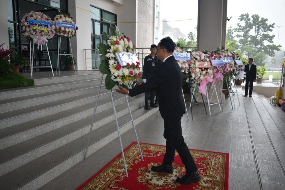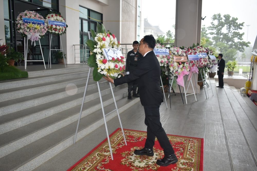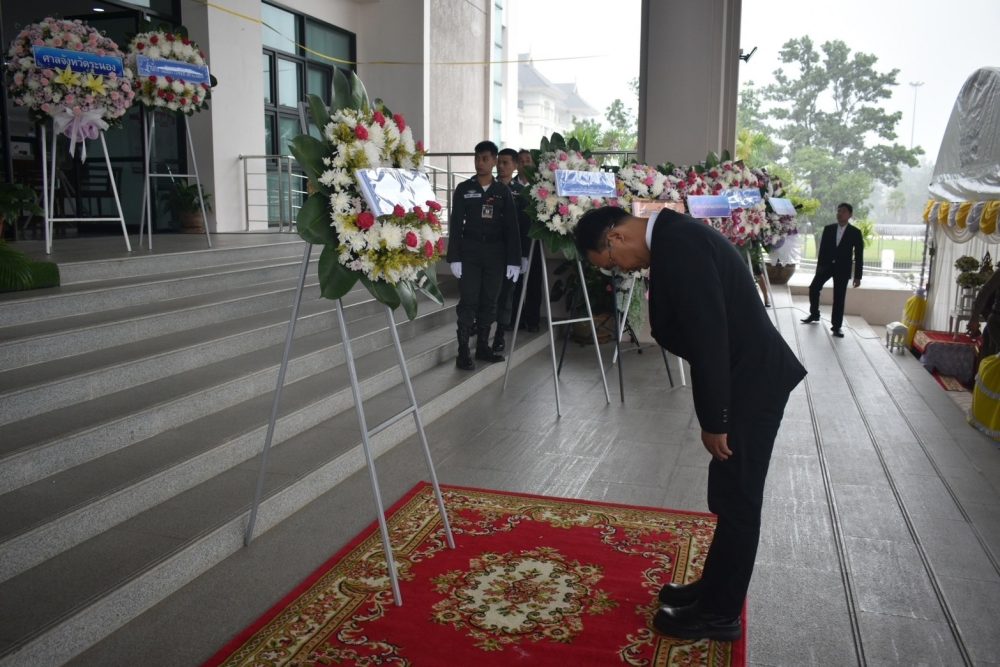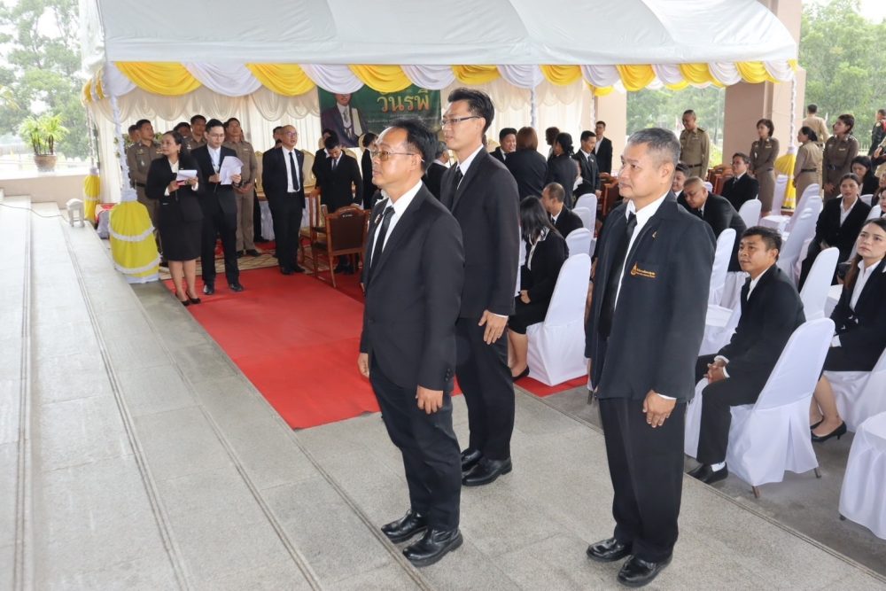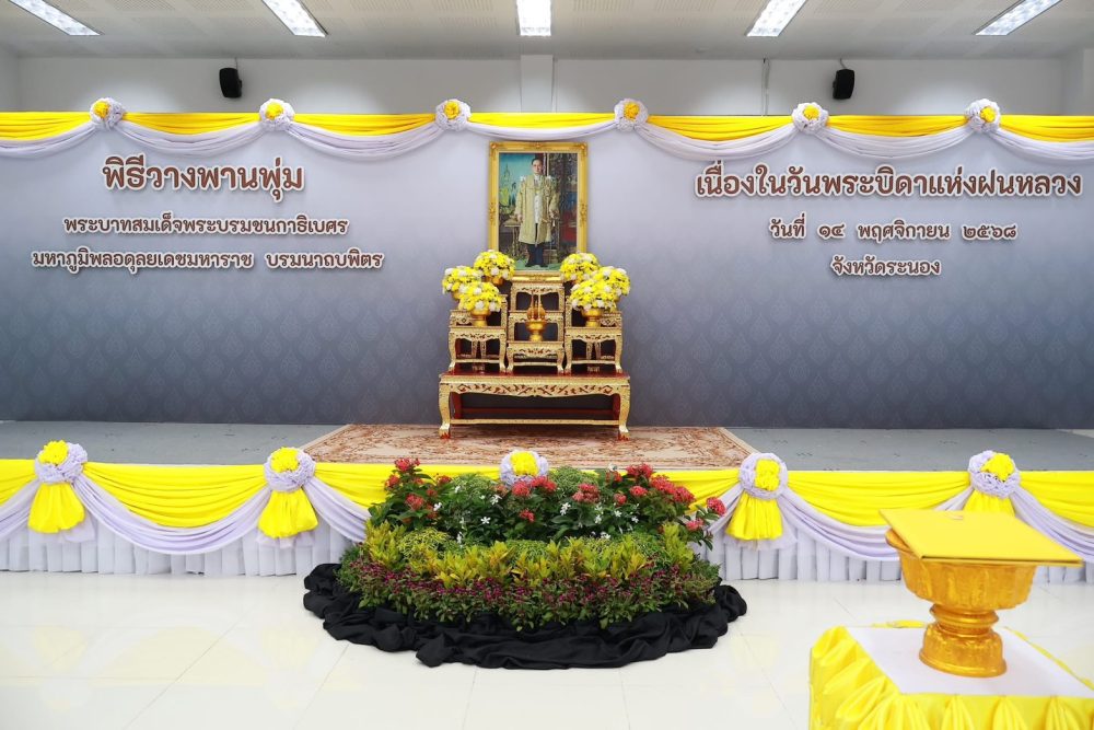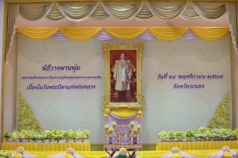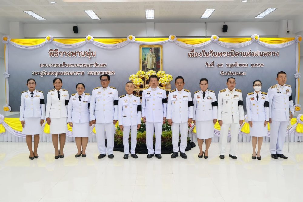 นายธนิต จตุรทิพประดับ อัยการจังหวัดประจำสำนักงานอัยการสูงสุด พร้อมด้วยข้าราชการฝ่ายอัยการ ร่วมพิธีวางพานพุ่มดอกไม้สด ถวายราชสักการะ เพื่อน้อมรําลึกในพระมหากรุณาธิคุณ พระบาทสมเด็จพระบรมชนกาธิเบศร มหาภูมิพลอดุลยเดชมหาราช บรมนาถบพิตร เนื่องในวันพระบิดาแห่งฝนหลวง ประจำปี ๒๕๖๗ ในวันพฤหัสบดีที่ ๑๔ พฤศจิกายน ๒๕๖๗ เวลา ๐๘.๐๐ น. ณ หอประชุมคอซู้เจียง ศูนย์ราชการจังหวัดระนอง