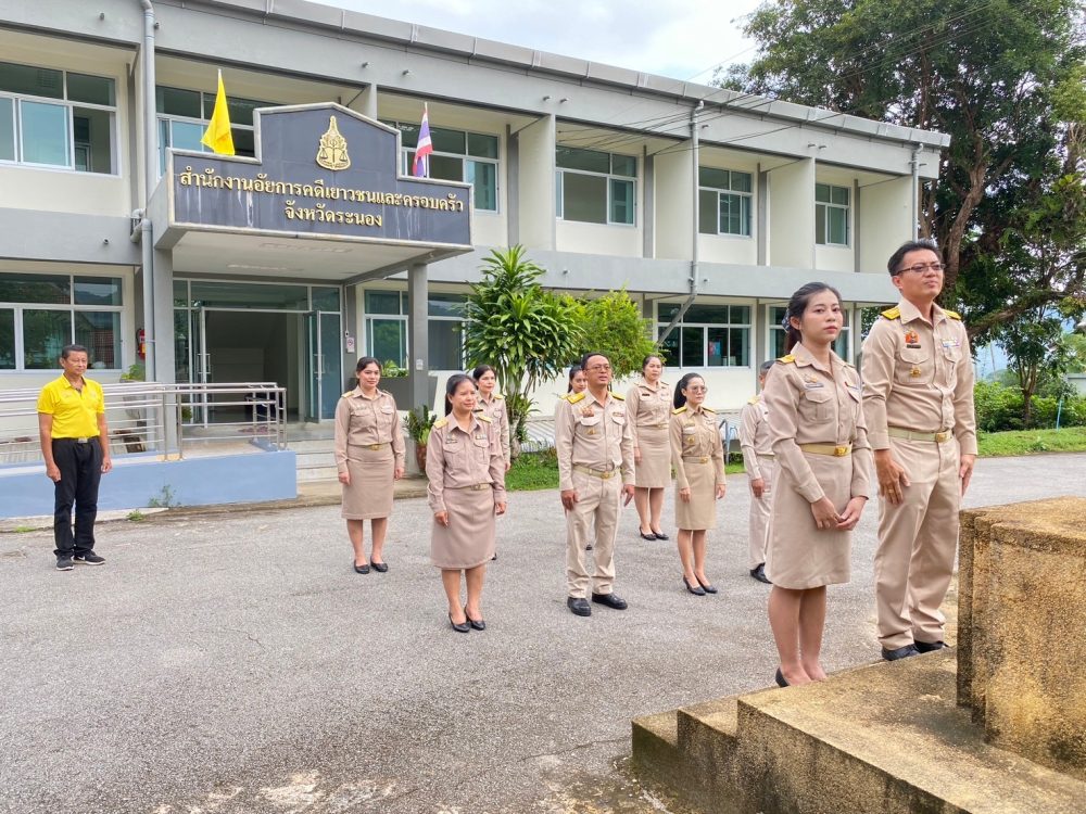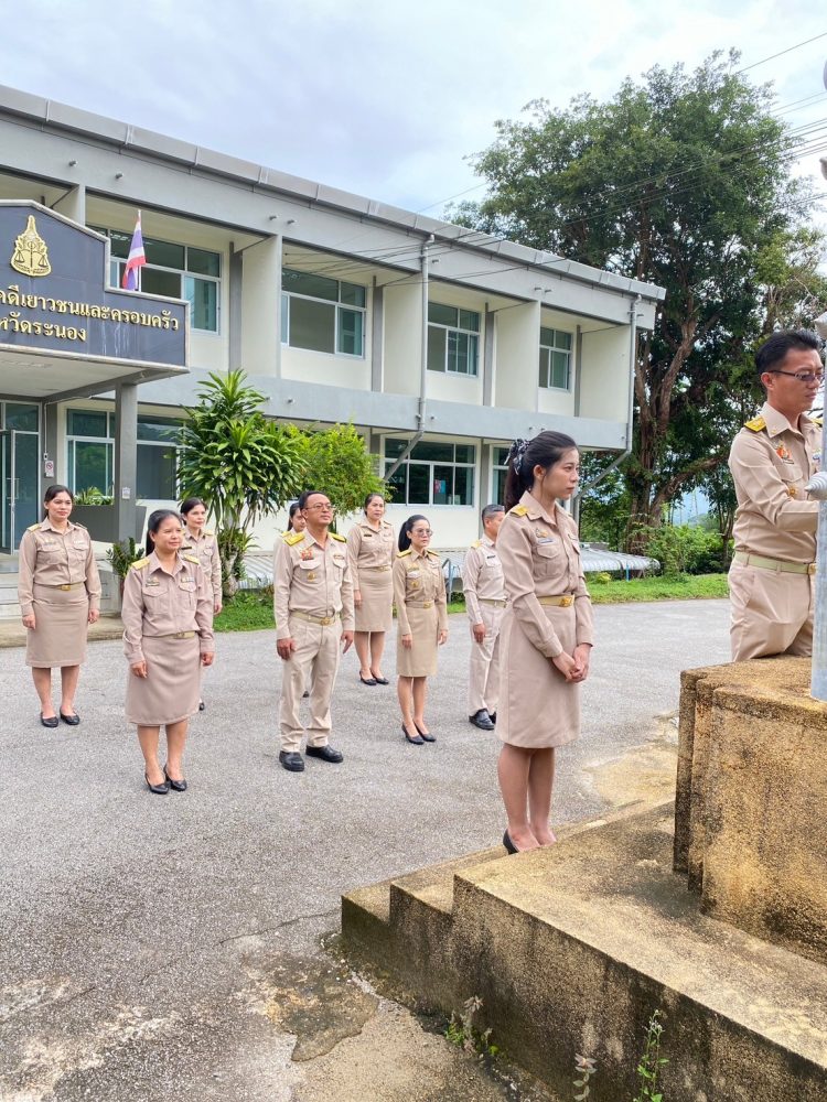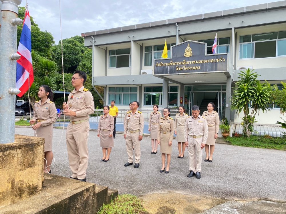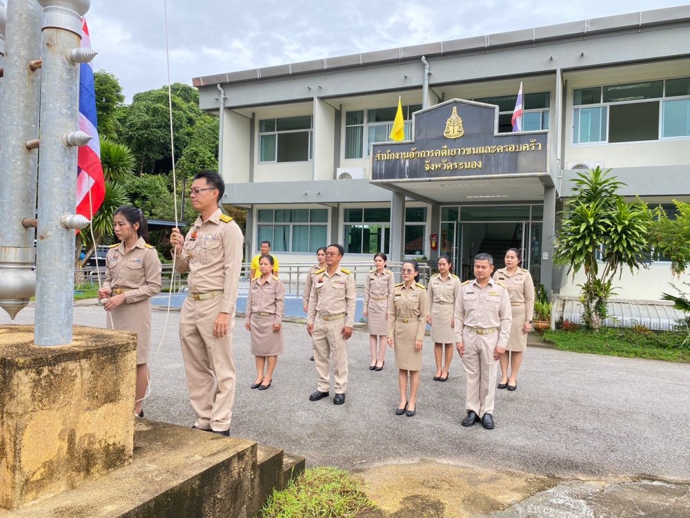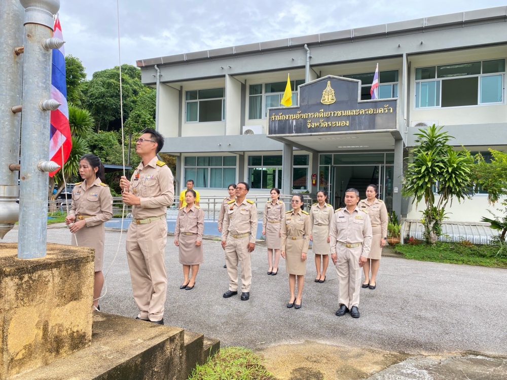 วันที่ 29 กันยายน 2568 เวลา 08.00 นาฬิกา นางภิญญดา เพชรทอง อัยการจังหวัดคดีเยาวชนและครอบครัวจังหวัดระนอง พร้อมด้วยข้าราชการฝ่ายอัยการ สำนักงานอัยการคุ้มครองสิทธิและช่วยเหลือทางกฎหมายและการบังคับคดีจังหวัดระนอง และสำนักงานคดีศาลสูงภาค 8 ส่วนสนับสนุนงานศาลสูงจังหวัดระนอง จัดกิจกรรมเคารพธงชาติและร้องเพลงชาติไทย เนื่องในวันพระราชทานธงชาติไทย 28 กันยายน (Thai National Flag Day) ประจำปี 2568 เพื่อเป็นการสร้างความภาคภูมิใจของคนในชาติ และเป็นการน้อมรำลึกในพระมหากรุณาธิคุณพระบาทสมเด็จพระมงกุฏเกล้าเจ้าอยู่หัวที่ทรงพระราชทานธงไตรรงค์เป็นธงชาติไทย ณ บริเวณเสาธงสำนักงานอัยการคดีเยาวชนและครอบครัวจังหวัดระนอง