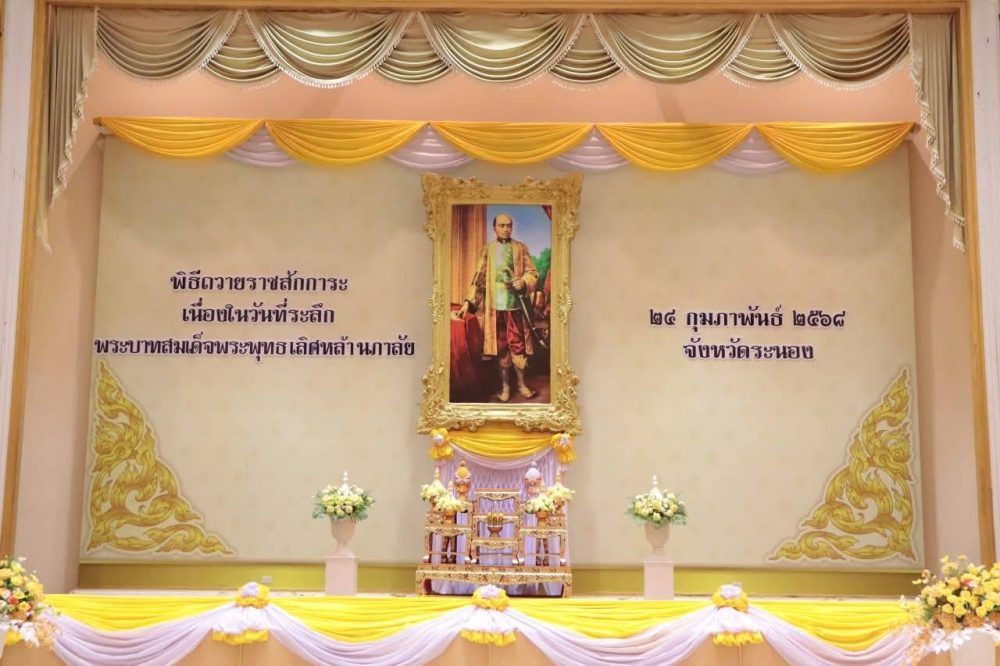 นายธนิต จตุรทิพประดับ อัยการจังหวัดประจำสำนักงานอัยการสูงสุด ร่วมพิธีถวายราชสักการะ เนื่องในวันที่ระลึกพระบาทสมเด็จพระพุทธเลิศหล้านภาลัย เพื่อแสดงความเคารพและน้อมรำลึกถึงพระมหากรุณาธิคุณ ในวันจันทร์ที่ ๒๔ กุมภาพันธ์ ๒๕๖๘ ณ หอประชุมคอซู้เจียง ศูนย์ราชการจังหวัดระนอง ตำบลบางริ้น อำเภอเมืองระนอง จังหวัดระนอง