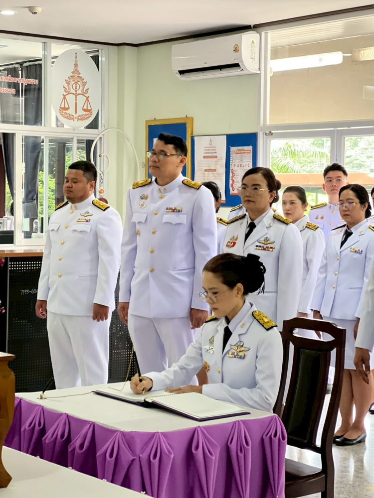 นางตะวัน ตังคโนภาส อัยการจังหวัดประจำสำนักงานอัยการสูงสุด สำนักงานคดีอาญาธนบุรี รักษาการในตำแหน่ง อัยการจังหวัดคดีเยาวชนและครอบครัวจังหวัดระนอง พร้อมด้วยข้าราชการฝ่ายอัยการ สำนักงานอัยการคดีเยาวชนและครอบครัวจังหวัดระนอง ร่วมลงนามถวายพระพรและพิธีถวายสัตย์ปฏิญาณเพื่อเป็นข้าราชการที่ดีและพลังแผ่นดิน เนื่องในวันเฉลิมพระชนมพรรษา พระบาทสมเด็จพระเจ้าอยู่หัว ในวันพุธที่ ๒๖ กรกฎาคม ๒๕๖๖ เวลา ๐๙.๓๐ น. ณ อาคารสำนักงานอัยการคดีเยาวชนและครอบครัวจังหวัดระนอง