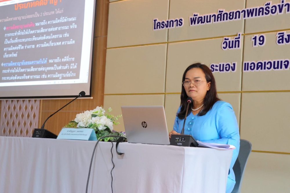 วันที่ 19 สิงหาคม 2568 สำนักงานอัยการคดีเยาวชนและครอบครัวจังหวัดระนอง โดยนางภิญญดา เพชรทอง อัยการจังหวัดคดีเยาวชนและครอบครัวจังหวัดระนอง ร่วมโครงการพัฒนาศักยภาพเครือข่ายสตรีจังหวัดระนอง ประจำปี 2568 ขององค์การบริหารส่วนจังหวัดระนอง โดยได้รับเกียรติเป็นวิทยากรบรรยาย หัวข้อ “ผู้หญิง…ความยุติธรรมและกฎหมาย เส้นทางสู่การเปลี่ยนแปลง” ให้กับผู้เข้าร่วมโครงการ จำนวน 300 คน ณ ระนอง แอเวนเจอร์ ปารค์ & รีสอร์ท ตำบลหงาว อำเภอเมืองระนอง จังหวัดระนอง