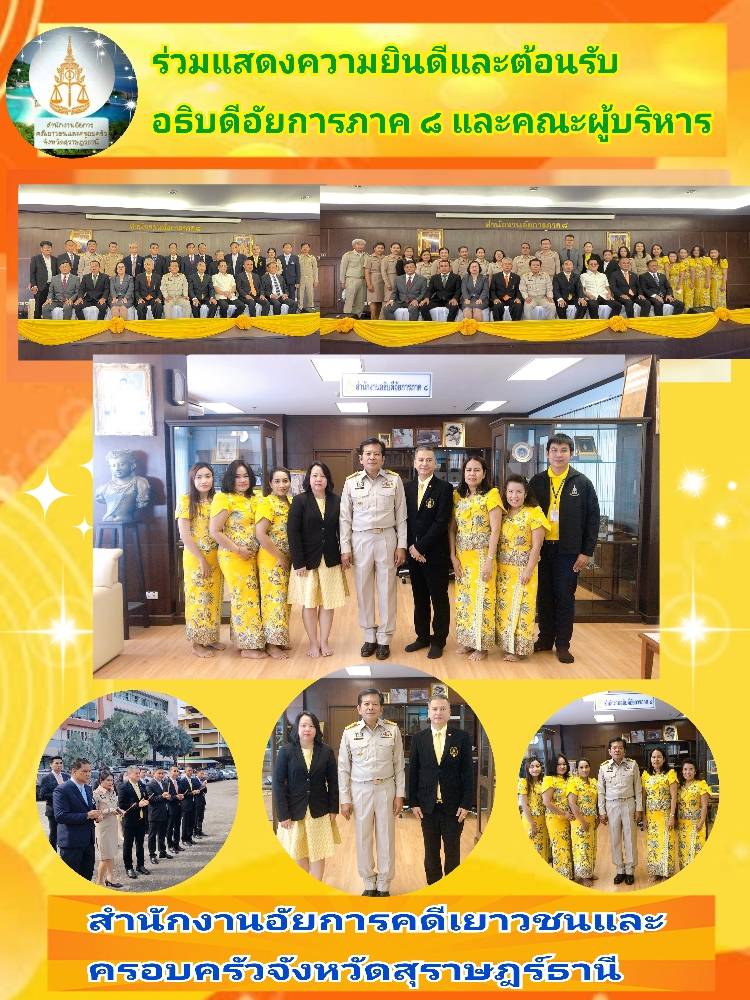 สำนักงานอัยการคดีเยาวชนและครอบครัวจังหวัดสุราษฎร์ธานี โดย นายธีระยุทธ์ รอดเจริญ พร้อมคณะ สำนักงานอัยการฯ ในสังกัดสำนักงานอัยการภาค 8 ข้าราชการฝ่ายอัยการ เจ้าหน้าที่ ร่วมแสดงความยินดีและต้อนรับ นายปิยวัฒน์ พรไชยา อธิบดีอัยการภาค 8 นายบรรเจิด รัตนมโนธรรม รองอธิบดีอัยการภาค 8 นายตะวัน สุขยิรัญ อัยการพิเศษฝ่ายคดีอาญา 2 ภาค 8 นายสุเวช จอมพงค์ อัยการอาวุโส และ นางวรรณเพ็ญ แก้วพนาสิริ อธิบดีอัยการสำนักงานคดีศาลสูงภาค 8 ในโอกาสโยกย้ายเข้ารับตำแหน่งใหม่ และร่วมแสดงความยินดีกับ นายฉัตรชัย ใจดี อดีตอธิบดีอัยการภาค 8 ในโอกาสเข้าปฏิบัติหน้าที่ในตำแหน่งอัยการอาวุโส ณ สำนักงานอัยการภาค 8 ด้วยความยินดียิ่งด้วยความยินดียิ่ง
