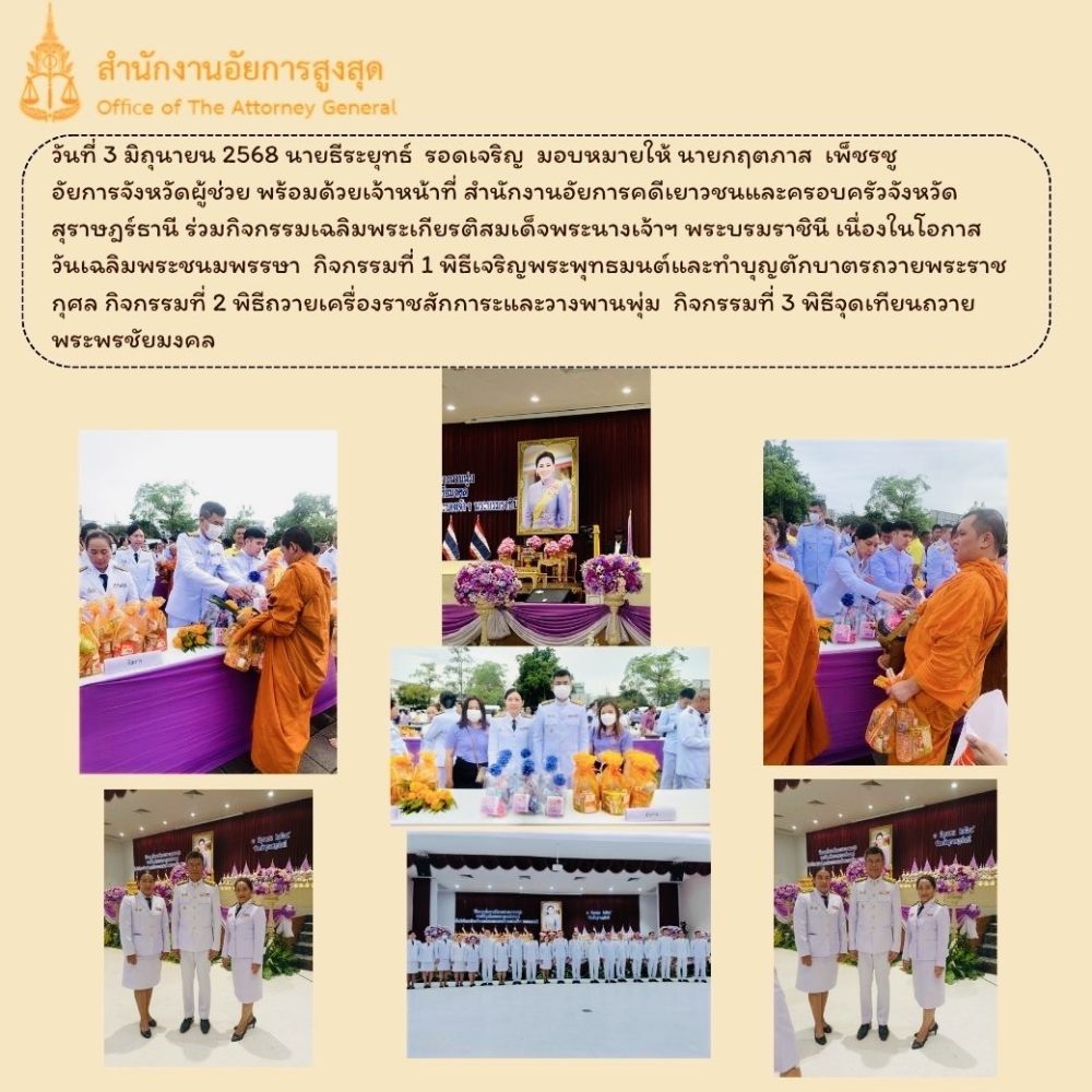 นายธีระยุทธ์ รอดเจริญ อัยการจังหวัดคดีเยาวชนและครอบครัวจังหวัดสุราษฎร์ธานี มอบหมายให้ นางสาววนิดา ทิพย์นวจินดา อัยการจังหวัดประจำสำนักงานอัยการสูงสุด พร้อมด้วยข้าราชการฝ่ายอัยการ ในสังกัด เข้าร่วมพิธีสวดมนต์ถวายพระพรชัยมงคล เนื่องในโอกาสวันคล้ายวันประสูติ สมเด็จพระเจ้าลูกเธอ เจ้าฟ้าพัชรกิติยาภา นเรนทิราเทพยวดี กรมหลวงราชสาริณีสิริพัชร มหาวัชรราชธิดา ประจำปี 2568 โดยมี นายจุมพฏ วรรณฉัตรสิริ ผู้ว่าราชการจังหวัดสุราษฎร์ธานี เป็นประธานในพิธีฯ ณ วัดธรรมบูชา พระอารามหลวง อำเภอเมืองสุราษฎร์ธานี จังหวัดสุราษฎร์ธานี