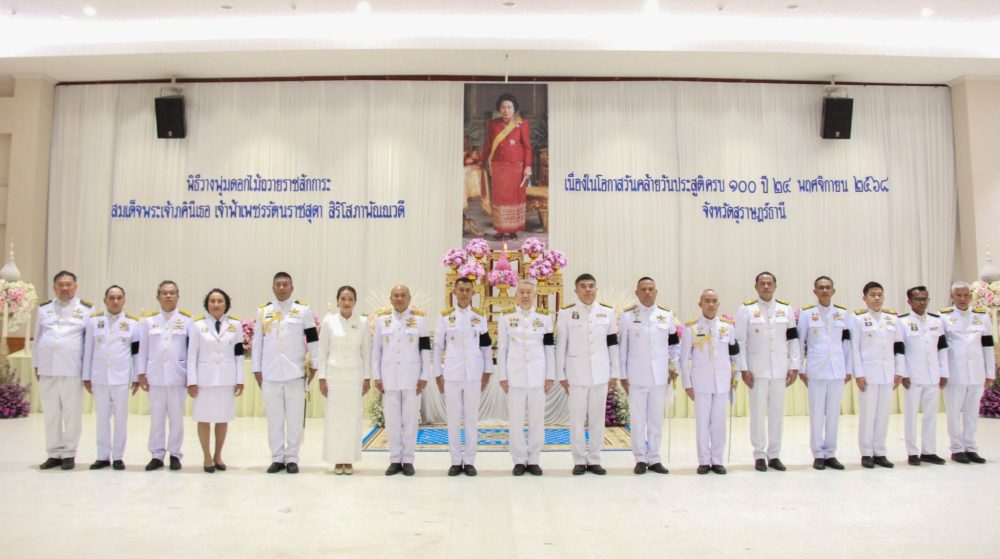 นายธีระยุทธ์ รอดเจริญ อัยการจังหวัดคดีเยาวชนและครอบครัวจังหวัดสุราษฎร์ธานี พร้อมข้าราชการฝ่ายอัยการในสังกัด ร่วมพิธีงานเฉลิมพระเกียรติ พิธีเจริญพระพุทธมนต์และทำบุญตักบาตร ถวายพระราชกุศล และวางพานพุ่มดอกไม้ สมเด็จพระภคินีเธอ เจ้าฟ้าเพชรรัตนราชสุดา สิริโสภาพัณวดี เนื่องในโอกาสวันคล้ายวันประสูติครบ 100 ปี ณ อาคารศูนย์กลางการประชุมสัมมนาภาคใต้ตอนบน ศาลากลางจังหวัดสุราษฎร์ธานี