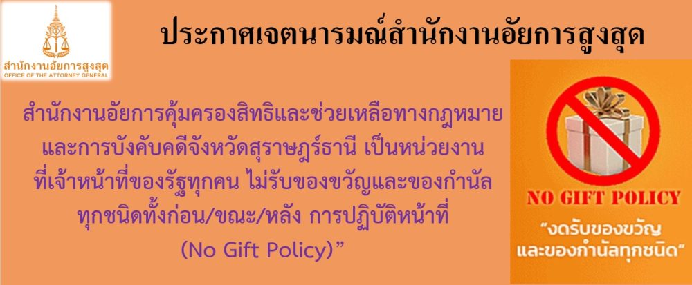 สำนักงานอัยการคุ้มครองสิทธิและช่วยเหลือทางกฎหมายและการบังคับคดีจังหวัดสุราษฎร์ธานี ขับเคลื่อนตามประกาศเจตนารมณ์ เรื่อง ไม่รับของขวัญและของกำนัลทุกชนิดจากการปฏิบัติหน้าที่ (No Gift Policy) ของสำนักงานอัยการสูงสุด