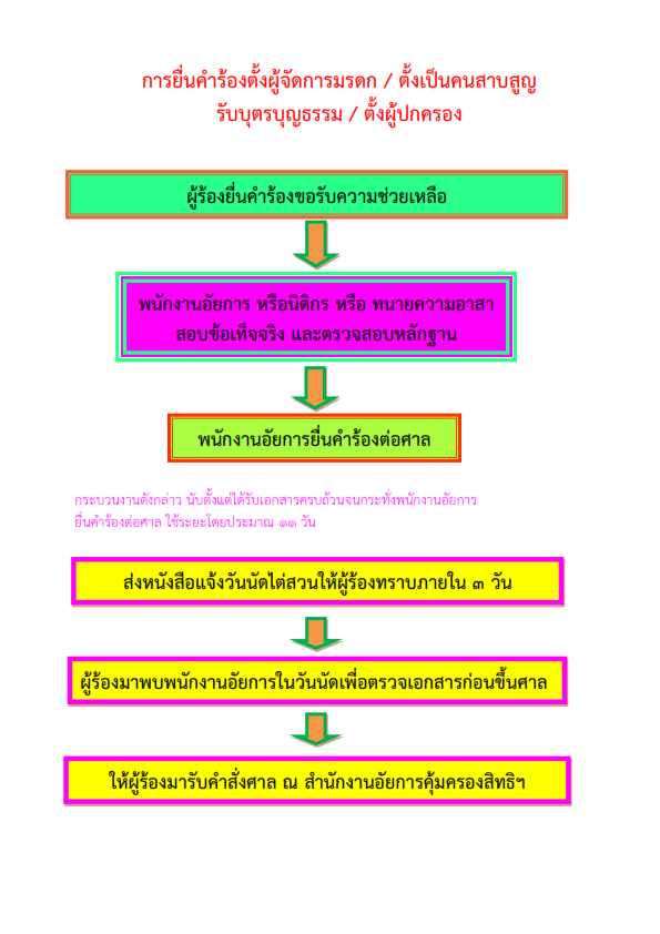 - ร้องขอให้ศาลตั้งผู้ปกครอง, ผู้อนุบาล หรือผู้พิทักษ์ ในกรณีที่มรดก ตกทอดแก่ผู้เยาว์ หรือบุคคลวิกลจริต หรือผู้ไม่สามารถจัดการงานตนเองได้ และบุคคลนั้น ยังไม่มีผู้แทนโดยชอบธรรม ผู้อนุบาล หรือผู้พิทักษ์ (ป.พ.พ. มาตรา