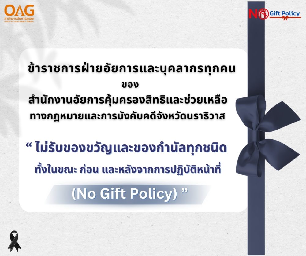 การขับเคลื่อนประกาศเจตนารมณ์ เรื่อง ไม่รับของขวัญและของกำนัลทุกชนิดจากการปฏิบัติหน้าที่ (No Gift Policy) ของสำนักงานอัยการสูงสุด ประจำปีงบประมาณ พ.ศ. ๒๕๖๘