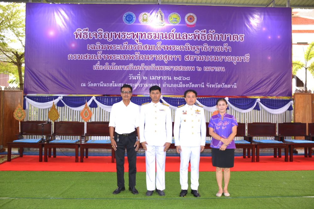 วันที่ ๒ เมษายน ๒๕๖๗ นายประทักษ์พงศ์ ลิ้มสกุล อัยการจังหวัดประจำสำนักงานอัยการสูงสุด สำนักงานอัยการจังหวัดปัตตานี รักษาการในตำแหน่งสำนักงานอัยการคดีเยาวชนและครอบครัวจังหวัดปัตตานี พร้อมข้าราชการธุรการ เข้าร่วมพิธีเจริญพระพุทธมนต์ และทำบุญตักบาตรถวายพระราชกุศล เนื่องในโอกาสวันคล้ายวันพระราชสมภพสมเด็จพระกนิษฐาธิราชเจ้า กรมสมเด็จพระเทพรัตนราชสุดาฯ สยามบรมราชกุมารี และวันอนุรักษ์มรดกไทย ณ วัดตานีนรสโมสร พระอารามหลวง อำเภอเมือง จังหวัดปัตตานี