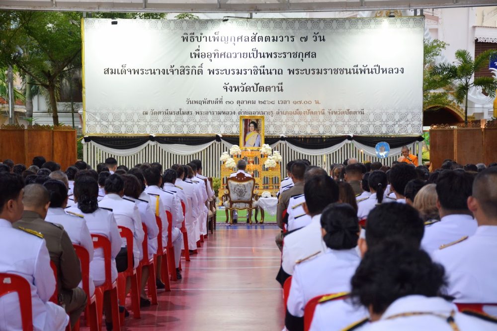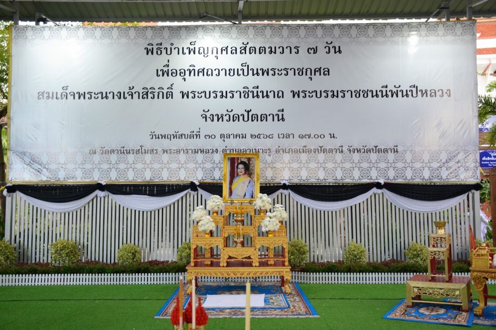 วันที่ ๓๐ ตุลาคม ๒๕๖๘ ข้าราชการฝ่ายอัยการ พร้อมด้วยบุคลากรสำนักงานอัยการคดีเยาวชนและครอบครัวจังหวัดปัตตานี เข้าร่วมพิธีบำเพ็ญกุศลสัตตมวาร (๗ วัน) เพื่ออุทิศถวายเป็นพระราชกุศลแด่สมเด็จพระนางเจ้าสิริกิติ์ พระบรมราชินีนาถ พระบรมราชชนนีพันปีหลวง ณ วัดตานีนรสโมสร พระอารามหลวง อำเภอเมืองปัตตานี จังหวัดปัตตานี