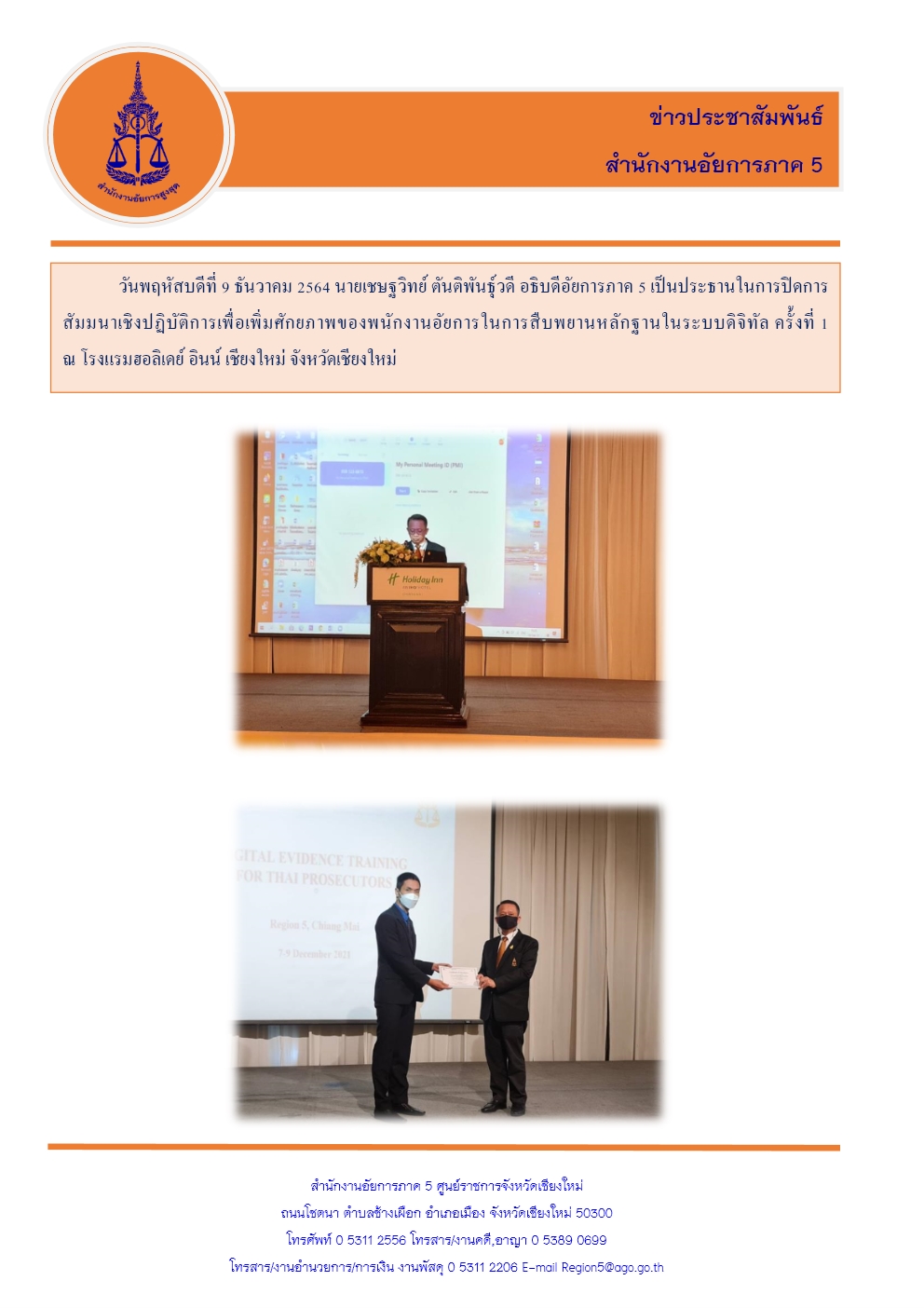 อธิบดีอัยการภาค ๕ เป็นประธานในการปิดการสัมมนาเชิงปฏิบัติการเพื่อเพิ่มศักยภาพของพนักงานอัยการในการสืบพยานหลักฐานในระบบดิจิทัล